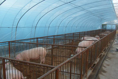 4、雙層塑料膜,霜在上層,漏下時(shí)卻用下層接住,不至于到處滴水。另外加了一層膜,還會(huì )增加保溫性能,對于不便于使用草簾的豬舍可起到一勞永逸的作用。里層塑料布因為舍內風(fēng)小,不需要太結實(shí),用鐵管或生產(chǎn)竹竿做支架都可以,所以成本也不高。   如果豬舍沒(méi)有了潮氣,也就不需要過(guò)多的通風(fēng);因為塑料大棚的空間足夠大,一般不會(huì )出現空氣不足現象。